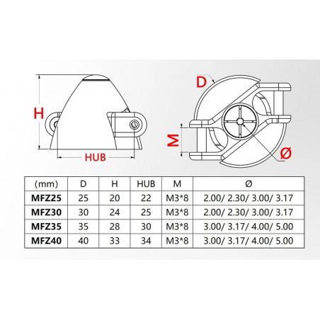 Cône aluminium diam. 25mm avec hélice repliable 6x4, 4 pinces de fixation incluses