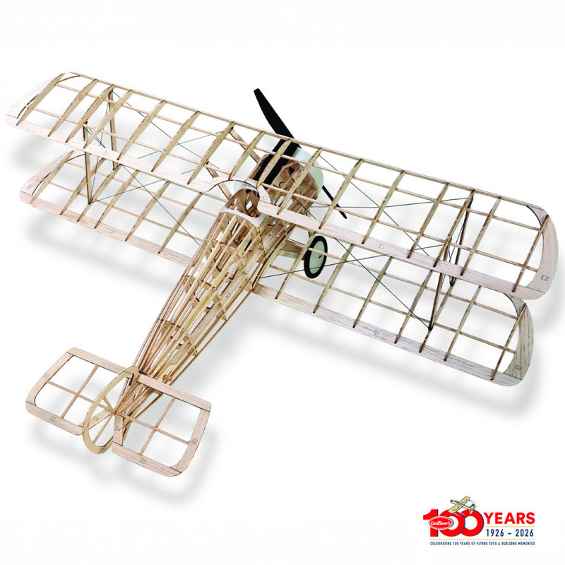 Questo kit da costruire in legno di balsa in scala 1/19 (apertura alare di 46 cm) offre oltre 20 ore di montaggio e include tutti gli elementi necessari: parti tagliate al laser, piani di costruzione dettagliati, decalcomanie, componenti in plastica stampata, elica, motore a elastico FAI Tan e rivestimento in carta velina.