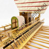 Construction tout bois par couples et listeaux, rostre, proue et ancre en bois moulé, dorure en laiton, accastillages, plaques de décoration pour le rostre tous ces éléments sont inclus dans la boîte de cette maquette à construire qui nous vient d’Italie.