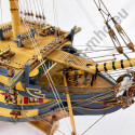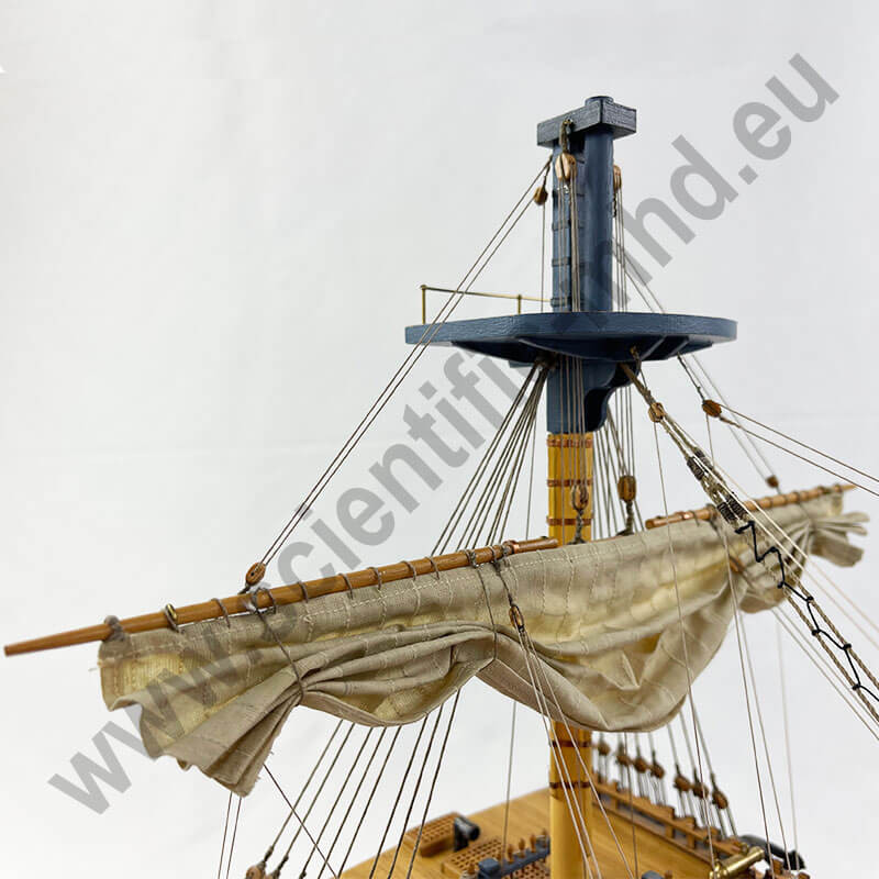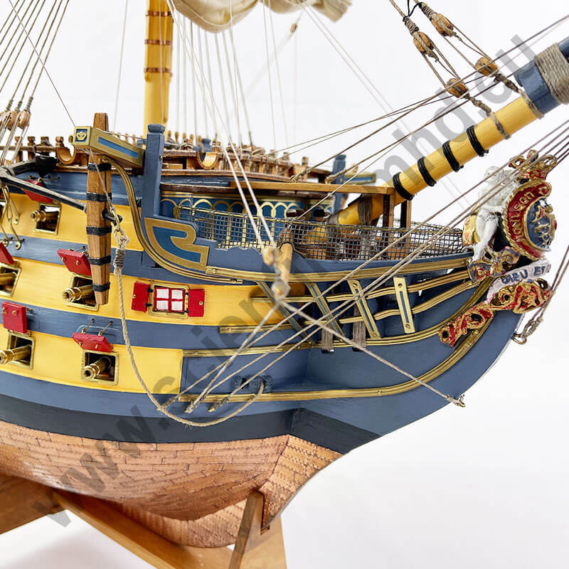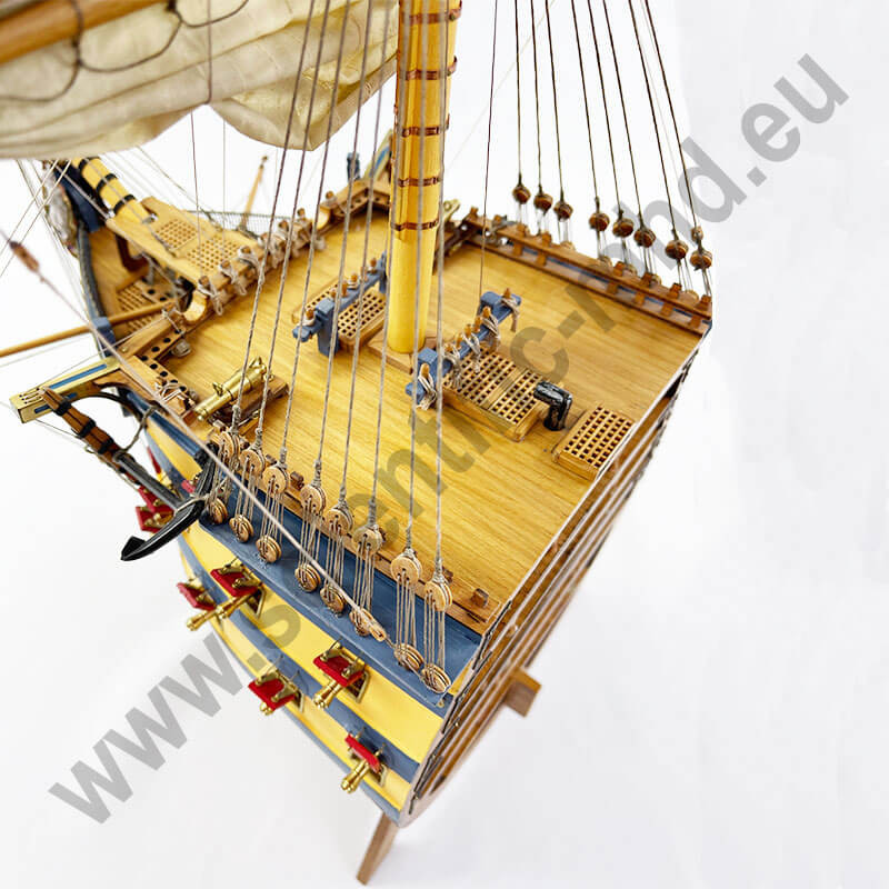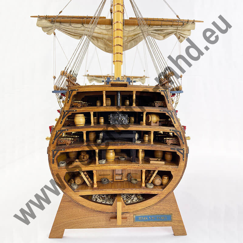 La prua del Victory era riccamente decorata con sculture raffiguranti figure allegoriche e mitologiche. Queste esprimevano i valori patriottici, religiosi e nautici dell’epoca. Il modello consente di ammirare questi dettagli artistici e simbolici che conferivano alla nave un profondo significato.