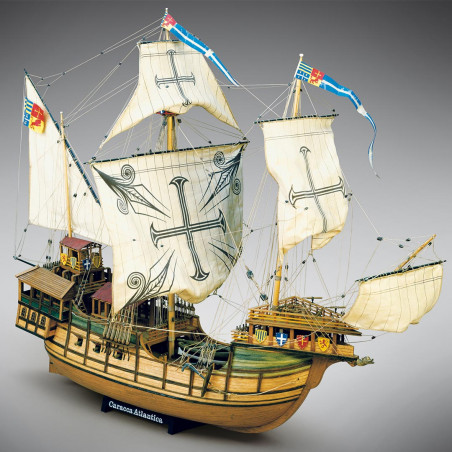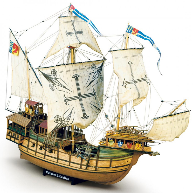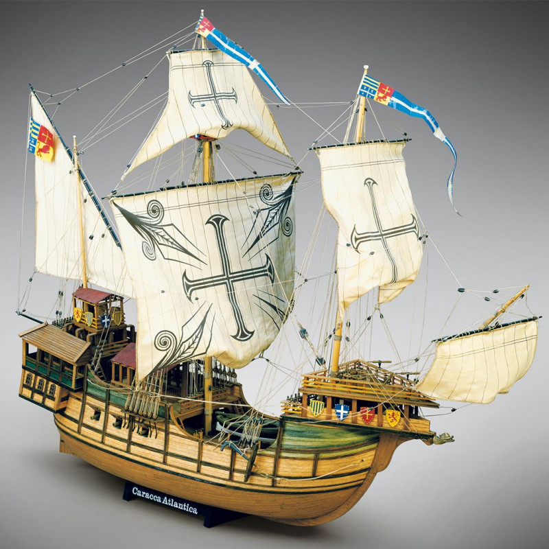 Trois-mât caraque. Longueur de la coque : 35 m. env. Hauteur du sommet du mât à la quille : 30 m. env. Les gravures d'époque et les documents trouvés dans les archives historiques du musée naval de Barcelone ont permis la reconstruction des plans d'un navire qui se place, pour ses lignes, entre la coque et le galion, classifiable, pour les structures particulières du gaillard d'avant et d'arrière, parmi les caraques. Elle participa, probablement vers 1519, à une importante expédition maritime, qui amena Fernando Cortez à conquérir le Mexique. Les galeries extérieures d'une desquelles le balcon, les appartements sous la petit gaillard d'arrière, les superstructures des ponts qui prévoient l'installation de tentes pour protéger du soleil, sont des signes énts de leur utilisation pour le transport de passagers de haut rang. Caractéristiques les écus de proue, peints en couleurs vives, ayant des fonctions purement décoratives.