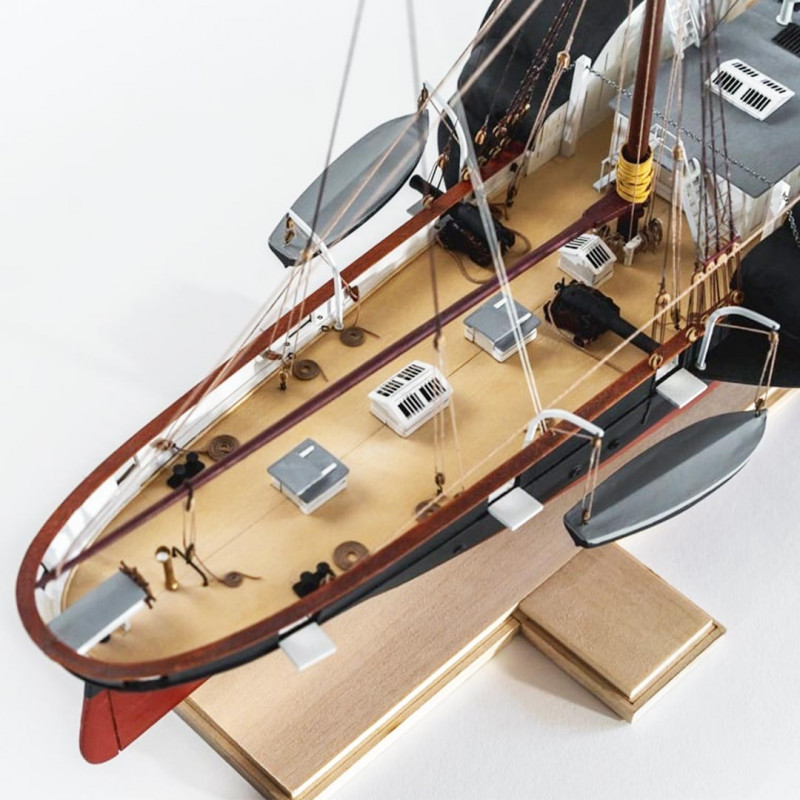 Construit en bois et en métal, il met en lumière la construction minutieuse à l'échelle, mettant en valeur les détails complexes de l'embarcation.