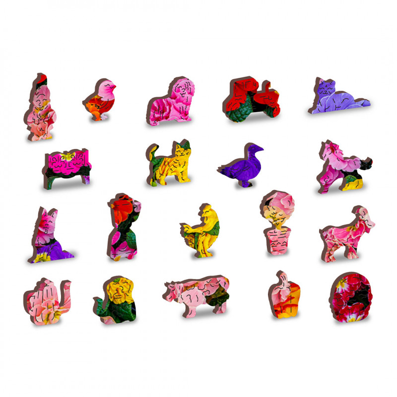 Alcuni pezzi riprendono forme di animali o elementi della campagna, rendendo il montaggio ancora più interessante e creativo.