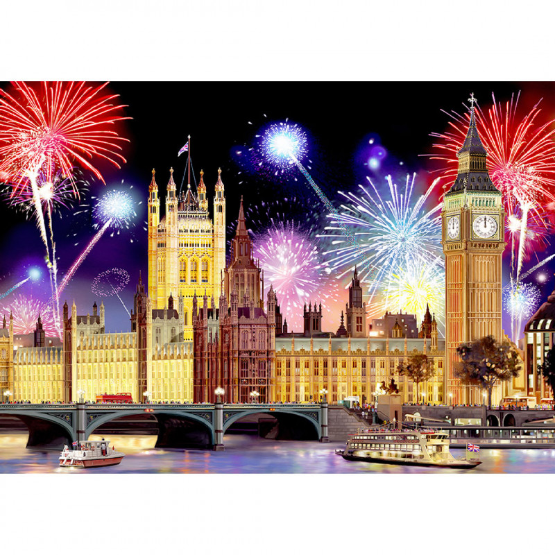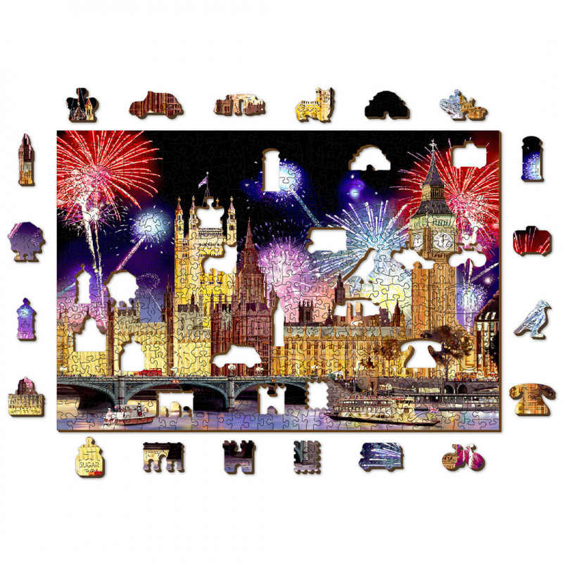 Assemblando questo puzzle per bambini e adulti, rivivi la magia notturna di Londra: il maestoso Palazzo di Westminster, l’intramontabile Big Ben, il classico autobus rosso che attraversa un ponte illuminato, i fuochi d’artificio e le barche turistiche che solcano dolcemente il Tamigi. Ogni dettaglio cattura il fascino e l’eleganza della città.