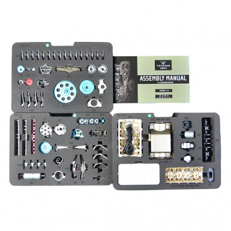 Questo modello in metallo da montare consente di visualizzare chiaramente il funzionamento interno di un motore. Ingranaggi, trasmissione e componenti meccanici sono visibili, offrendo un'esperienza coinvolgente per ogni appassionato di motori in miniatura.