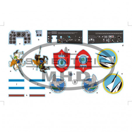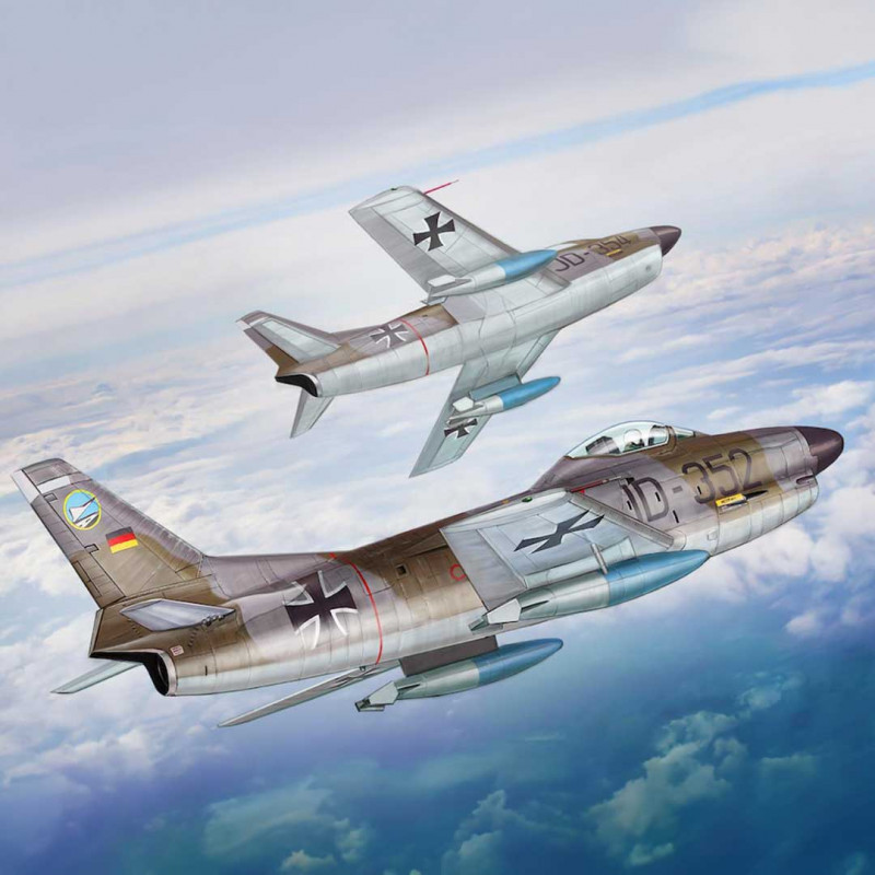 Le North American F-86 Sabre est un chasseur à réaction emblématique de l'après-Seconde Guerre mondiale, célèbre pour ses ailes en flèche et ses performances exceptionnelles. Utilisé par une trentaine de pays et produit en plusieurs milliers d'exemplaires, il est notamment célèbre pour ses duels avec le MiG-15 pendant la guerre de Corée. Le F-86K est une version dérivée du F-86D, simplifiée sur le plan électronique et équipée de quatre canons de 20 mm à la place des roquettes, spécifiquement destinée à l'exportation. Cette maquette présente une version utilisée par l'Armée de l'Air française, avec des décorations pour la BundesLuftwaffe (Allemagne de l'Ouest), l'USAF, l'Armée de l'Air italienne et la Force aérienne norvégienne des années 50 et début des années 60.