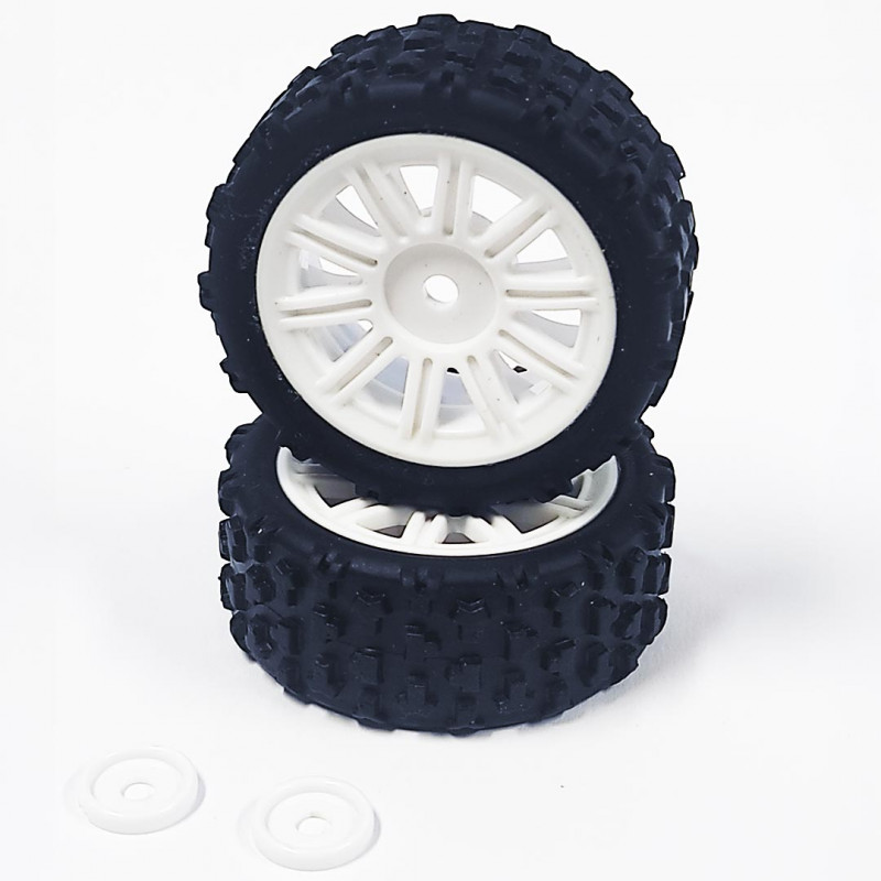 Paire de pneus medium sur jantes rallye blanches à rayon pour Stinger Piste 1/14 réf: Z85045.