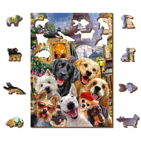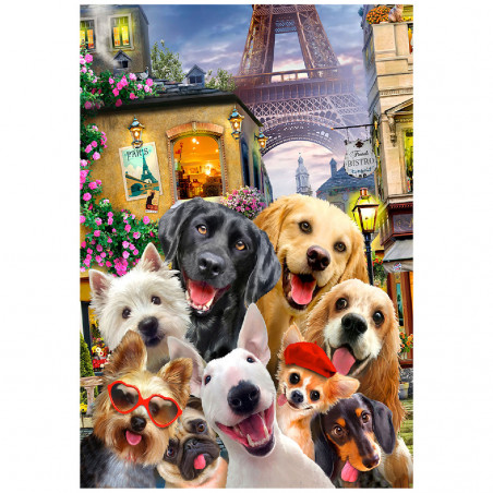 Questo puzzle da 200 pezzi raffigura adorabili cuccioli che si scattano un selfie davanti alla Torre Eiffel.