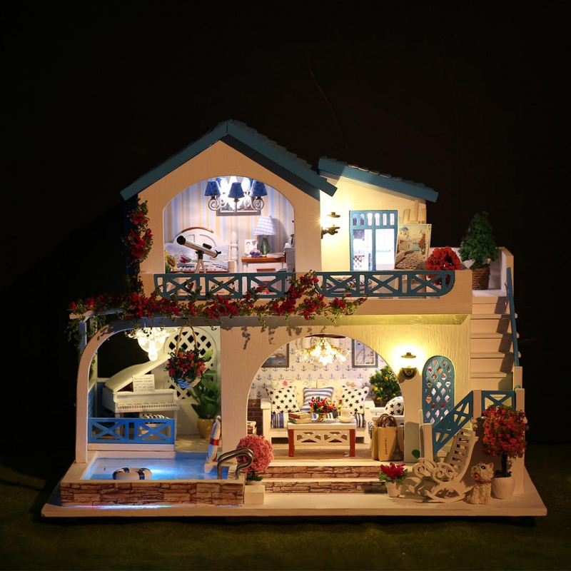 Città Blu e Bianca, Casa delle bambole in miniatura, principalmente in legno, carta e tessuto da montare da soli (Fai da Te).