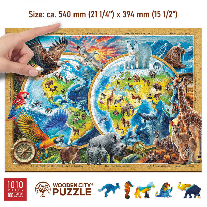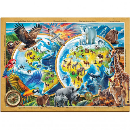 Questo puzzle da 1000 pezzi raffigura una mappa ricca di animali provenienti da ogni continente: balene, tigri, orsi polari, pappagalli e molti altri. Ogni dettaglio è curato per mostrare la bellezza della Terra.